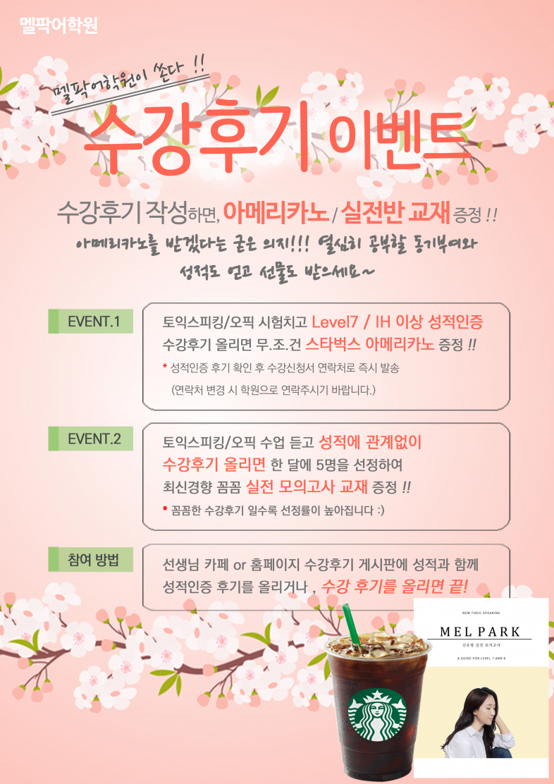 이벤트 | 멜팍어학원 수강후기 이벤트~! 페이지 정보 작성자 MELPARK 작성일16-03-15 11:07 조회3,988회 댓글0건 이전글 다음글 목록 본문 멜팍어학원 성적인증/수강후기 이벤트~!!성적향상을 위한 동기부여와 함께아메리카노 받고 실전반 교재로 고득점 노려보세요~!! 댓글목록 등록된 댓글이 없습니다. 이전글 다음글 목록