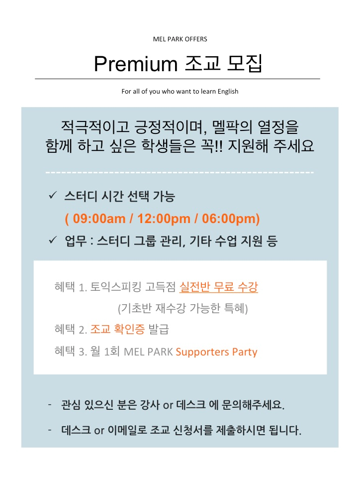공지 | 멜팍어학원 프리미엄 조교 상시모집~!