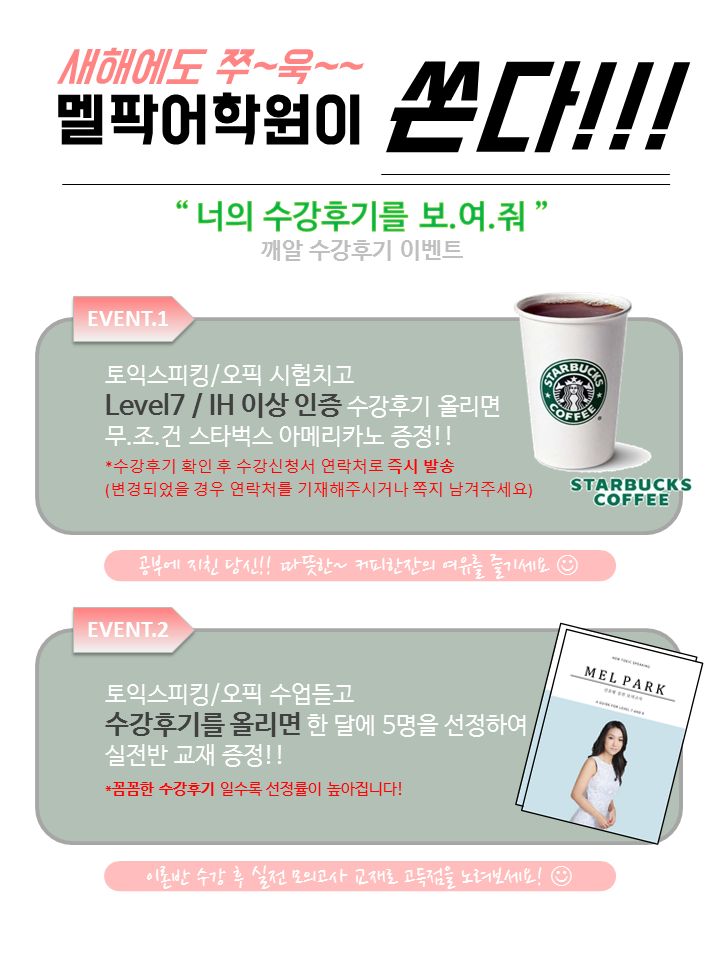 이벤트 | 수강후기 아메리카노 증정 이벤트!!! 페이지 정보 작성자 MELPARK 작성일16-02-11 15:21 조회3,480회 댓글0건 이전글 다음글 목록 본문 댓글목록 등록된 댓글이 없습니다. 이전글 다음글 목록