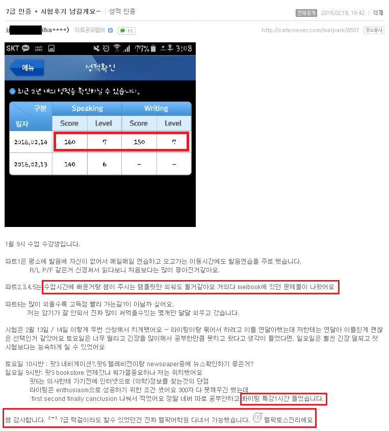 토스 | (대구토스 7급후기) 토익스피킹 & 토익롸이팅 모두 7급!! 멜팍토스는 진리♥ 페이지 정보 작성자 MELPARK 작성일16-02-23 09:17 조회4,196회 댓글0건 이전글 다음글 목록 본문 (클릭 하시면 크게 보실 수 있습니다.) 수강생 후기 입니다. 더 많은 후기는 우측 카페 링크 가입 후 보실 수 있습니다. 이전글 다음글 목록