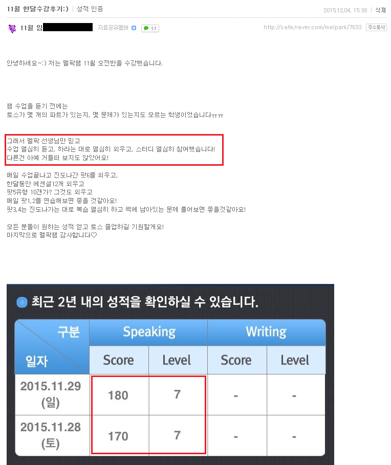 토스 | (대구토스 7급후기)선생님만 믿고 하라는대로 했더니^^ 한달 180점 7급 획득!! 페이지 정보 작성자 MELPARK 작성일15-12-07 17:04 조회4,395회 댓글0건 이전글 다음글 목록 본문 (클릭 하시면 크게 보실 수 있습니다.) 수강생 후기 입니다. 더 많은 후기는 우측 카페 링크 가입 후 보실 수 있습니다. 이전글 다음글 목록