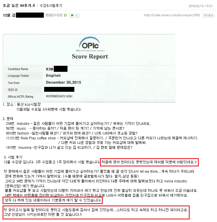오픽 | (대구오픽 IH후기) 처음에 영어 하나도 못했는데..선생님 덕분에 IH 획득!! 페이지 정보 작성자 MELPARK 작성일16-02-17 11:22 조회4,075회 댓글0건 이전글 다음글 목록 본문 (클릭 하시면 크게 보실 수 있습니다.) 수강생 후기 입니다. 더 많은 후기는 우측 카페 링크 가입 후 보실 수 있습니다. 이전글 다음글 목록